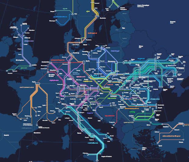 Europe night and sleeper train map